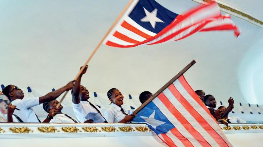 Youths wave Liberian flags during the 2014 UN Day celebrations at the Centennial Pavilion in Monrovia. Photo: UNMIL | 24 Oct 14
