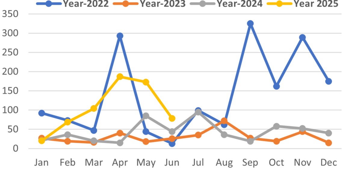 Overall, in the second quarter of this year, 334 incidents of conflict-related violence were recorded, affecting 1518 civilians, including 198 women and 155 children. Compared to the same period in 2024, this represents a five percent increase in incidents and a 43 percent increase in victims. Concerningly, compared to the same period in 2024, those killed rose by 44 percent (442-635), and injuries increased by 128 percent (297 to 676).