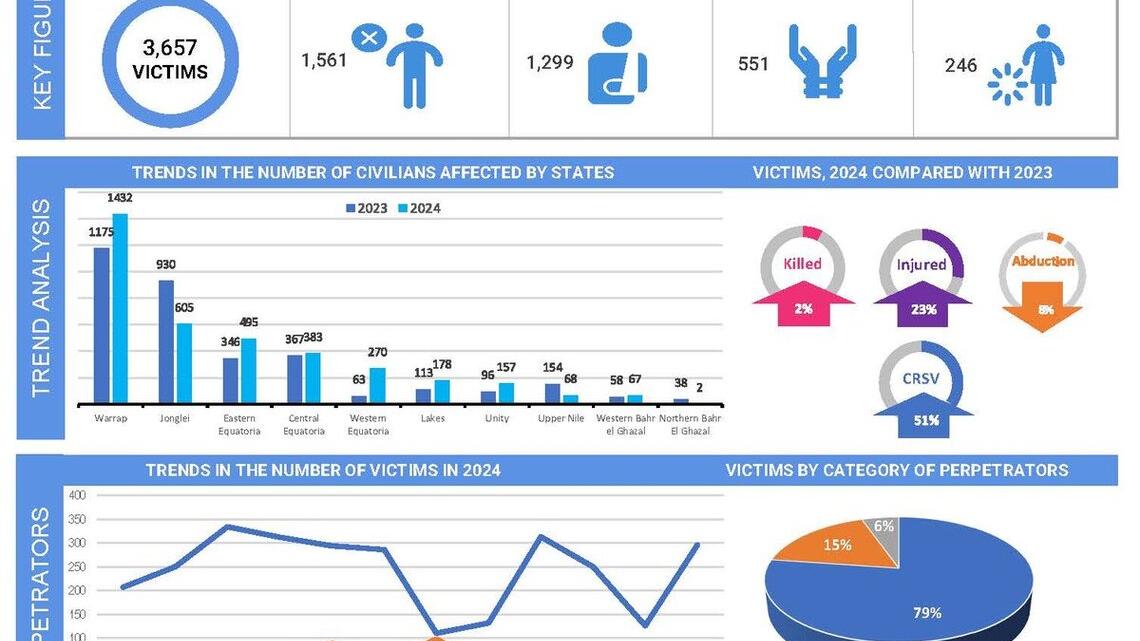 JUBA - Civilians in South Sudan continue to bear the brunt of violence, with a concerning 51 percent increase in victims harmed by conventional parties to the conflict and other armed groups, as well as a similar rise in incidents of conflict-related sexual violence (CRSV) documented in the 2024 annual brief by the United Nations Mission in South Sudan (UNMISS).Between January and December 2024, UNMISS documented 1,019 violent incidents affecting 3,657 civilians, with 1,561 killed, 1,299 injured, 551 abducted, and 246 subjected to CRSV. This marks a 15 percent increase in violent incidents (from 885 to 1019) and a nine percent increase in victims (from 3,340 to 3,657) as compared with 2023.Armed communal violence by community-based militias and/or civil defense groups remained the leading cause of harm against civilians, accounting for 79 percent of victims. Consistently, Warrap State recorded the highest number of civilian deaths and injuries, whereas Western Equatoria State documented the highest number of sexual violence. The majority of abductions took place in Central Equatoria State, mainly by alleged members of National Salvation Front splinter groups, followed by Jonglei State, allegedly by Murle armed elements.“Protecting civilians and preventing violence requires urgent action by authorities at the national, state and local levels as well as by communities to address the root causes of conflict and find non-violent solutions. Promoting dialogue, reconciliation and social cohesion is critical to defusing tensions and building trust,” said Nicholas Haysom, the Secretary-General’s Special Representative to South Sudan and the Head of UNMISS. The Mission notes that the Government of South Sudan bears primary responsibility to protect civilians and calls on national and state authorities to take appropriate measures to end violence, defuse tensions, and hold perpetrators accountable.UNMISS supports these efforts by conducting thousands of peacekeeping patrols by land, air, and river each year. The Mission also supports community efforts to promote reconciliation and peacebuilding through dialogue and actively assists political and peace processes, including security and justice sector reform, constitution-making, and preparations for elections.