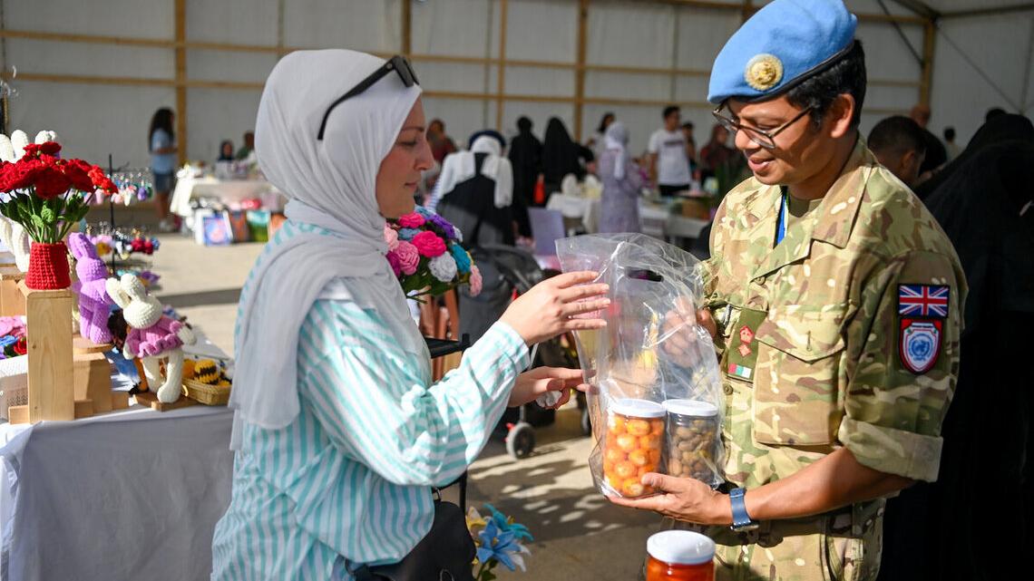 One of the stallholders, Rana Zein from Bujr al-Shemali in Tyre, said UNIFIL’s participation in the event “meant a lot” to her. “This makes me happy that my products are spreading to foreigners,” she said. “I hope peace spreads and that UNIFIL stays with us and helps us to preserve peace.” The head of the Municipal Committee for Women and Children, Dr. Randa Abu Saleh, said, “This exhibition represents a tangible opportunity to enhance the work of women, promote their economic empowerment, and support their active role in the social and economic life of the community.”