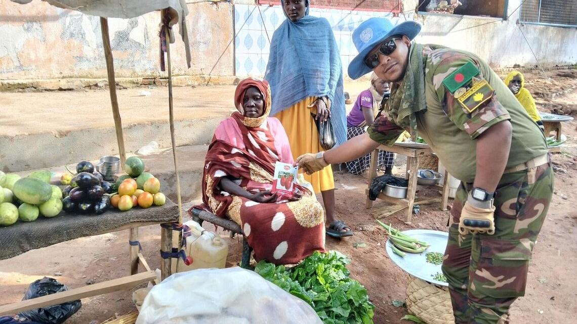 As day breaks at the United Nations base in Wau, dozens of peacekeepers are already bustling about, preparing for an important patrol to remote Deim Zubeir in the north-western corner of South Sudan.Their mission is to assess the security and humanitarian situation in an area plagued by severe food shortages, a lack of access to clean water, healthcare and education, exacerbated by an influx of thousands of refugees and returnees fleeing the conflict in Sudan.Having made this journey many times, the civilian and uniformed peacekeepers know there will be many challenges. The first obstacle is the heavily damaged roads, with the convoy having to repeatedly come to a complete halt to navigate its way, one vehicle at a time, through deep pits filled with muddy floodwater. A 300-kilometer trip that should take just a few hours, takes an entire day.Lurking in the dirty stagnant water is another threat: mosquitos carrying the deadly malaria parasite.Several peacekeepers are infected, becoming severely ill very quickly, and requiring a medical evacuation by helicopter from Deim Zubeir later in the four-day visit.Despite the challenges, the peacekeeping team perseveres. They meet with community members, including those who are displaced from their homes, as well as security services and local authorities. The condition of the roads is top of the agenda, as a lack of access affects peace efforts as well as the economy.“The road from Raja to Wau and onto the capital Juba is a lifeline for our communities. The conditions are very bad and there is a risk that, at any time during the rainy season, we can be cut off,” says County Commissioner, Addison Arkangelo Musa. “The price of commodities is also affected, with traders complaining that they have to raise prices in the market to compensate for the cost of overcoming transportation challenges.”“We are doing our best to carry out repairs, even mobilizing youth to carry rocks and bricks, but we need support from the State and national level with technical expertise, equipment and cement,” he says. Also affected by the dire humanitarian situation, are the forces gathered at Dulu cantonment site, waiting to be integrated into the National Unified Forces.“We are facing significant challenges, including a lack of food, medication and other basic services,” says Major General Musa Dakumi. “We have sent information about the situation to Juba and hope that there will be a response soon. However, we remain patient for the sake of peace.”Building resilience is a priority for these proud communities. “People want to be self-reliant and to contribute to the economic growth of Western Bahr El Ghazal. However, there are many challenges, including the rainy season coming two months late this year, which will impact all farmers,” says County Commissioner, Addison Arkangelo Musa.Responding to that challenge, military peacekeepers from Bangladesh on the patrol donated packages of vegetable seeds to vulnerable community members, such as 52-year-old Khadija Matar Zubeir who fled to Sudan during the conflict in 2016 but returned to Raja when war broke out across the border. “In the past, farming and selling vegetables has enabled me to take care of my eight children. That is what I am trying to do again now. These seeds will help me make a fresh start and restore my dignity in supporting my own family rather than living off humanitarian aid,” she says.“This is just a small example of our efforts to support the people of Raja to develop livelihoods, promote sustainable agricultural activities, and collectively build peace,” says Major Ataur Suzan, an UNMISS peacekeeper from Bangladesh.