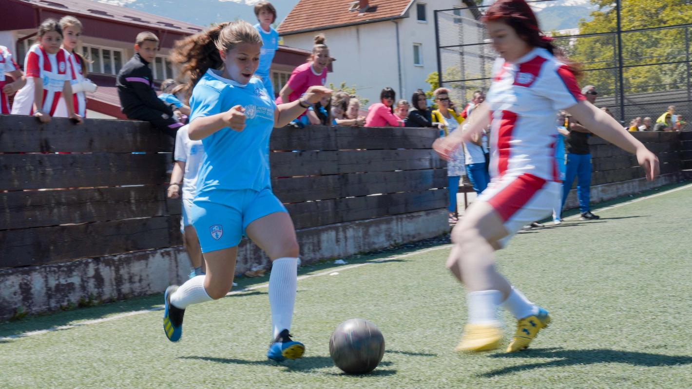 From cheering for their teammates on the sidelines to exhilarated hugs as they dash down the field after scoring a goal; running for water and care for injured team members, they spend hours every week just learning the game, learning about each other and exposing themselves to new realities. Football has helped bring together these young girls from across Kosovo communities both on and off the field.
