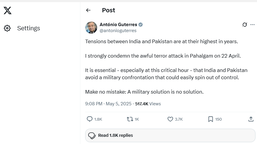 HomeHomenewsSG António Guterres on X SG António Guterres on X 05 May 2025António Guterres on X: "Tensions between India and Pakistan are at their highest in years. I strongly condemn the awful terror attack in Pahalgam on 22 April. It is essential - especially at this critical hour - that India and Pakistan avoid a military confrontation that could easily spin out of" / XShare