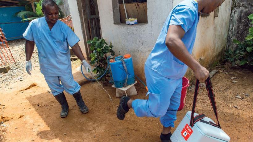 A Liberian Ministry of Health worker in Monrovia sprays the soles of a colleague’s shoes at an Ebola Isolation Clinic as they leave with blood specimens for testing. Photo: Staton Winter | UNMIL | 11 Jul 14