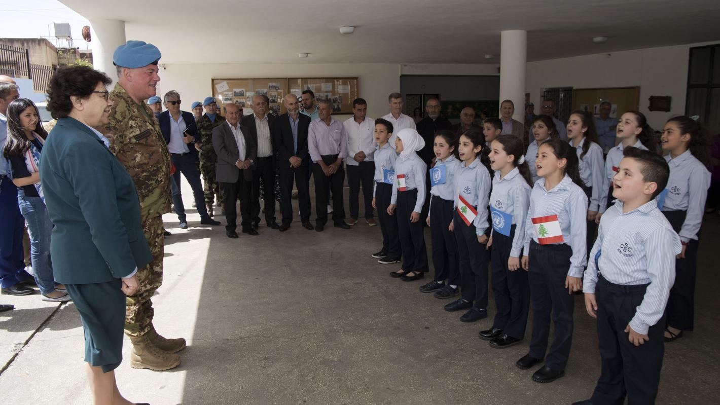 Students of St. Joseph School in Ein Ebel, south Lebanon, greet UNIFIL Head of Mission Maj. Gen. Stefano Del Col as he arrives in the school to see their cross-cultural event with a school in Italy.