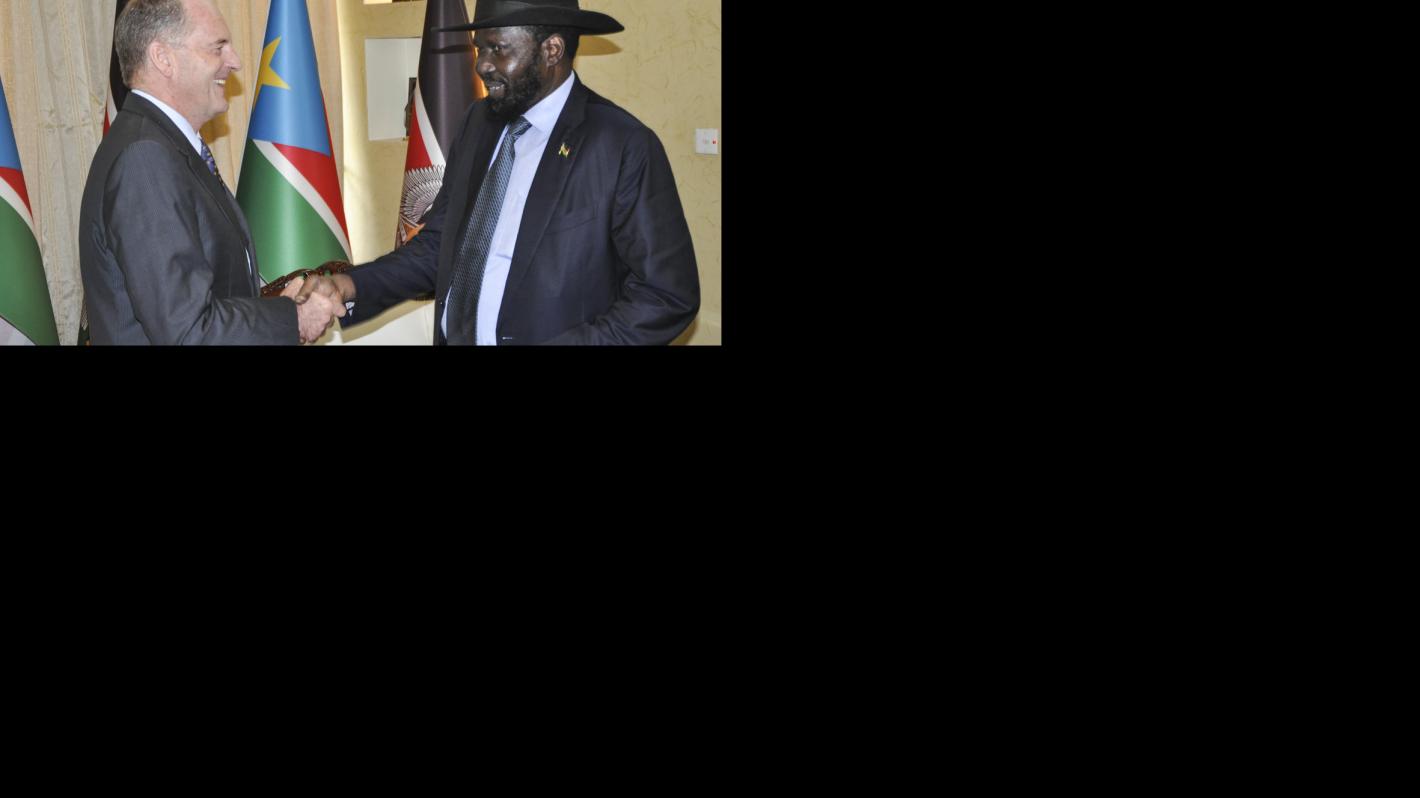 David Shearer, head of the UN peacekeeping mission in South Sudan (UNMISS), left, greets the President of South Sudan, Salva Kiir, on Wednesday, 6 September, 2017.