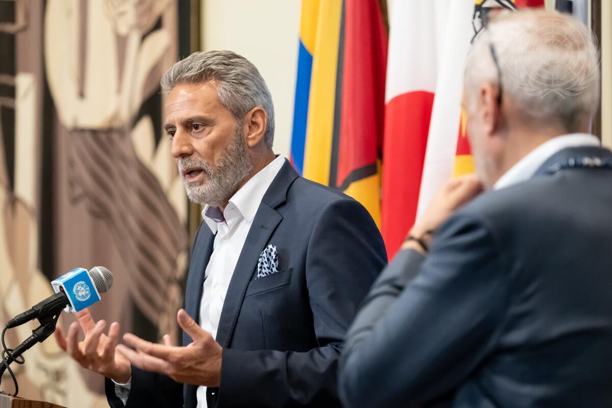 Muhannad Hadi, Deputy Special Coordinator, Resident and Humanitarian Coordinator for the Occupied Palestinian Territory of the Office of the United Nations Special Coordinator for the Middle East Peace Process, briefs reporters at UN Headquarters. (UN Photo/Mark Garten - 17 July 2024)