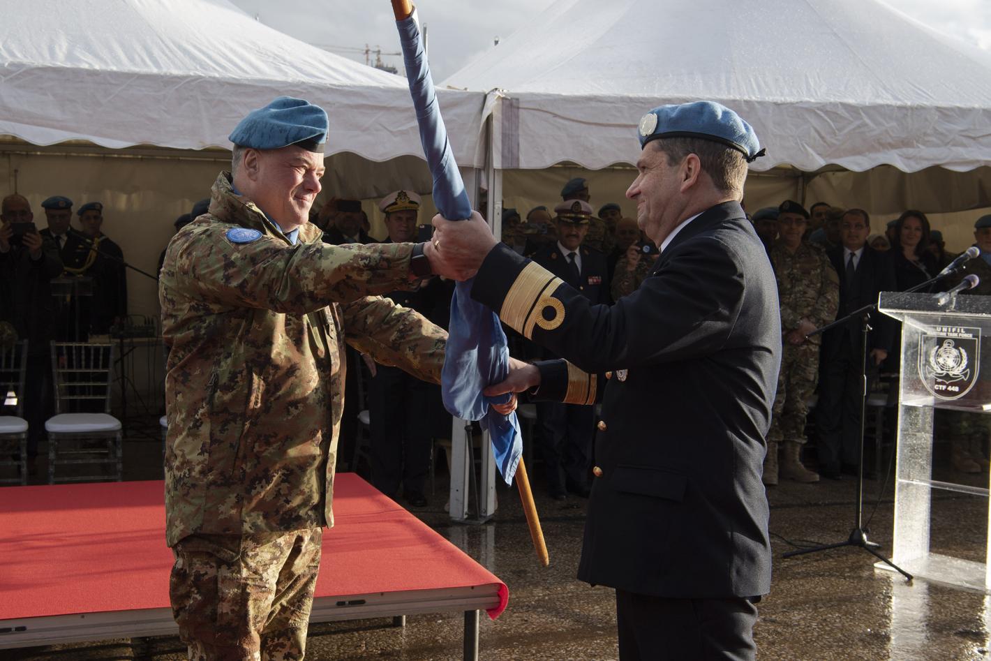 Rear Admiral Eduardo Augusto Wieland of Brazil (right) assumes command of UNIFIL MTF, receiving the UNIFIL flag from UNIFIL chief Maj. Gen. Stefano Del Col. UNIFIL’s Maritime Task Force (MTF) got a new commander last week…