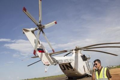 UNMISS Chief Air Operations Officer Jorge Jackson and MI-26 mission helicopter, which can carry 90 troops or 20,000kg of cargo. Air travel is often the only way to ferry passengers and materials around South Sudan during the…