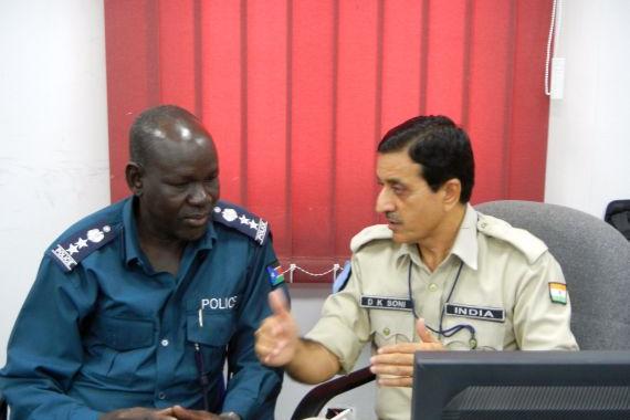 UN Police Advisor Dalip Soni conferring with a South Sudan National Police Service officer in Juba. Seeking to assist in building the capacity of local police, UN Police officers mentor local counterparts as part of their…
