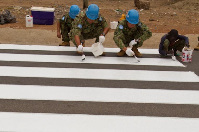 UNMISS Japanese peacekeepers painting one of five zebra crossings they created in Juba on 9 March. About 100 peacekeepers participated in the UNICEF-coordinated "Zebra Crossing Project", which aimed to assist in preventing…