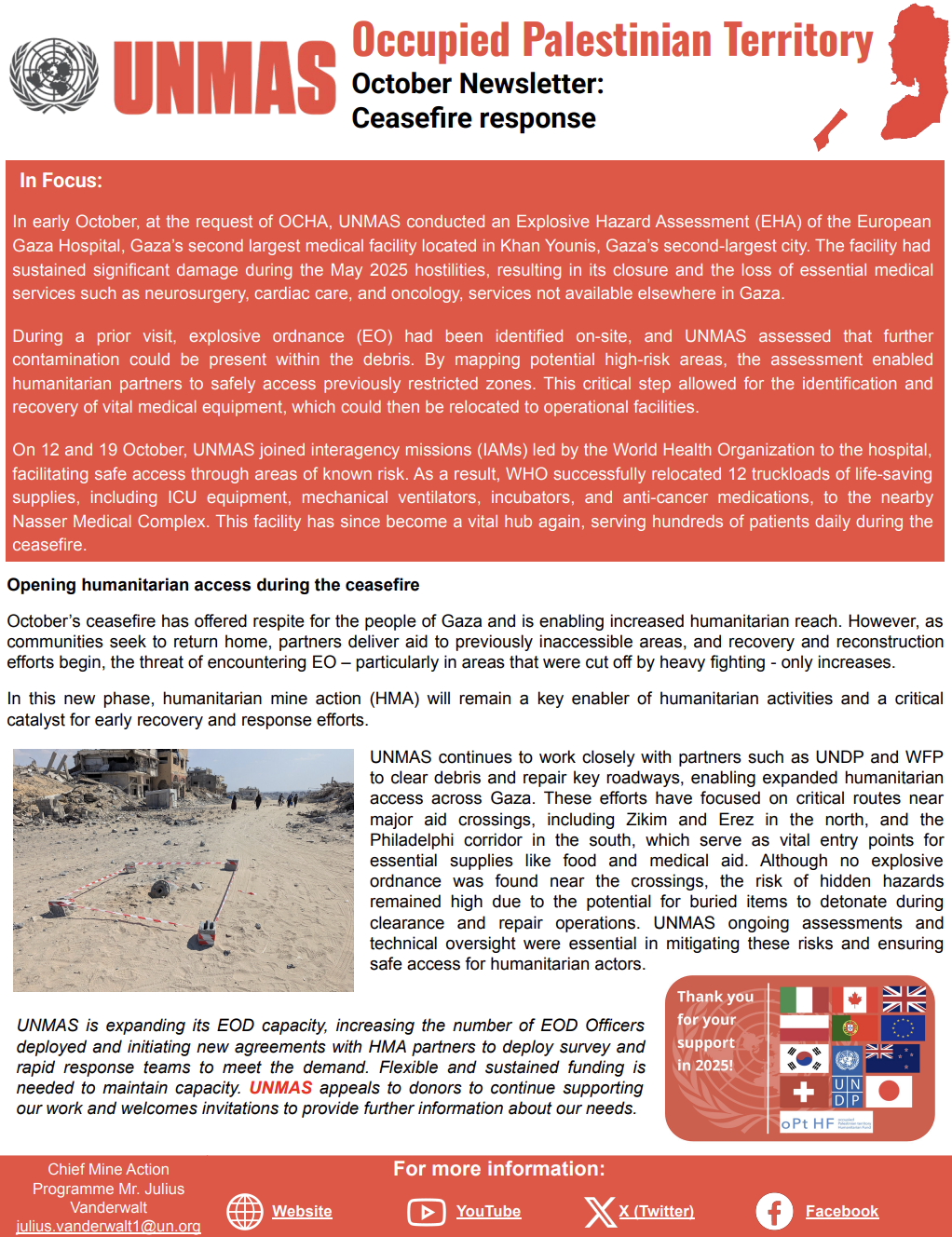 Through collaboration with partners and donors, UNMAS remains committed to safeguarding civilian lives and securing a safer future for communities in the OPT. UNMAS OPT appeals to donors to continue supporting our work in providing a mine action response in Gaza and the West Bank. Invitations to provide further information about UNMAS requirements are welcome.