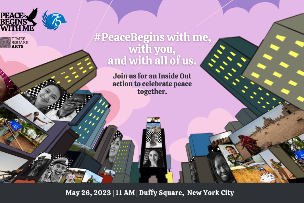 As we commemorate UN Peacekeeping's 75th anniversary, we invite you to join us for an Inside Out action at 11am EST on 26 May in Times Square to celebrate all the people who work together to build and maintain peace across the world, from peacekeepers to community members and local influencers in the places where our missions operate. For 75 years, UN peacekeeping has made a tangible difference to the lives of millions of people caught up in conflict. The Inside Out action is a way to thank peacekeepers, past and present, for their service and sacrifice, and pay tribute to the courageous people who brave conflict and strive for peace in the face of adversity. They inspire us all to take action in the knowledge that #PeaceBeginsWithMe.