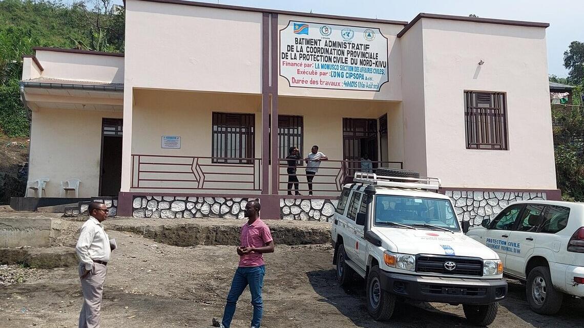 Créé en 2003 par l’ancien gouverneur, Eugène Serufuli, à la suite des dégâts causés par l’éruption du volcan Nyiragongo en 2002, le service de la protection civile ne possédait pas encore de locaux propres, pour mener à bien la prévention et la gestion des catastrophes dans la province du Nord-Kivu. C’est dorénavant chose faite grâce au partenariat entre les autorités de la RDC et la MONUSCO, dans le cadre de la consolidation de l’autorité de l’Etat.