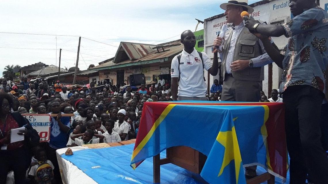 Bunia, le 15 octobre 2019 – Deux vols spéciaux de la MONUSCO affrétés par la Coordination des Nations Unies pour la Réponse d’urgence contre Ebola (EERC), deux Gouverneurs de Province (Ituri et Nord-Kivu) et deux Chefs de Bureau de la MONUSCO (Ituri et Beni) pour une même destination : Biakato à 250 kilomètres de Bunia en Ituri et pour un même objectif : parler d’Ebola, cette maladie dont certains ici continuent à nier l’existence et l’assimilent à une « invention ». D’où cette mobilisation des deux autorités provinciales, avec l’appui de la MONUSCO, pour une sensibilisation des populations locales.