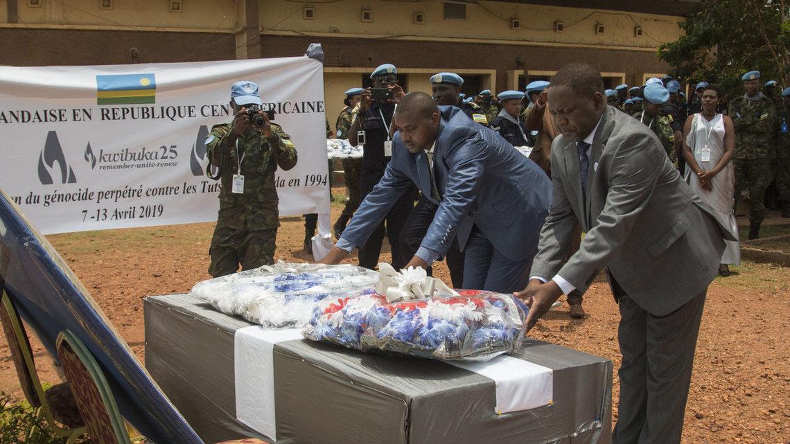 Digne et solennelle, la cérémonie a été parsemée de discours de différentes autorités, notamment du Premier ministre et chef du Gouvernement, Firmin Ngrebada, du chef de la MINUSCA, Mankeur Ndiaye, du Commandant du bataillon rwandais, le Colonel Vincent Ntazinda, ainsi que du Président de la communauté rwandaise en RCA, Nicolas Rugira. Elle a aussi donné lieu à l’allumage de la flamme du souvenir ainsi qu’à une minute de silence en hommage aux victimes. Kwibuka 25, les commémorations de ce 25e anniversaire du génocide, sous le thème du Souvenir, de l’Unité et du Renouvellement (Remember – Unite – Renew), dureront toute la semaine dans la capitale centrafricaine.