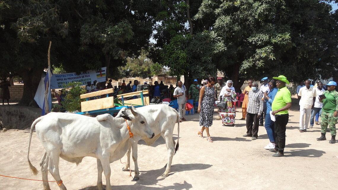 Les bénéficiaires sont les membres du groupement « Organisation Paysanne Rurale de Base (OPRB) » ; créé en 2012 et composé de 106 veuves, 39 femmes abandonnées (par leurs maris) et 28 orphelins. L’OPRB bénéficie de cette assistance de la MINUSCA après de nombreuses sollicitations selon sa présidente, Henriette NGAKOUTOU. Elle s’est dit satisfaite des équipements reçus : une paire de bœufs, un attelage, une charrette, une charrue, 76 houes, 5 machettes, des semences de sorgho et d’arachide ainsi que des boutures de manioc ; le tout pour une valeur de près de deux millions de francs CFA.