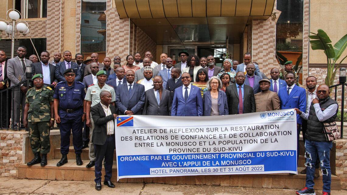 Organisé du 30 au 31 août 2022 à Bukavu, cet atelier visait à servir de cadre de réflexion pour une analyse conjointe de la situation qui a conduit à une rupture de confiance entre la MONUSCO et les populations du Sud-Kivu, à la suite des récentes manifestations violentes dans certaines villes de l’est du pays pour demander le départ de la MONUSCO du territoire national. Les manifestants dénonçaient la persistance de l'activisme des groupes armés et des tueries enregistrées dans le pays depuis plus de deux décennies déjà.