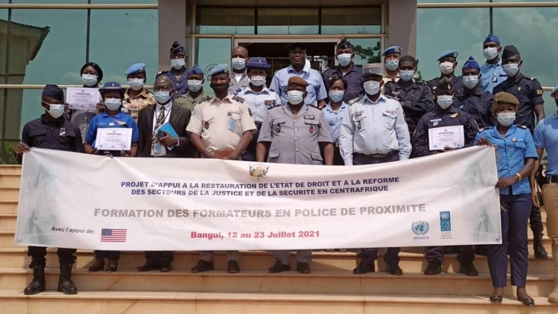 Vingt acteurs, dont cinq femmes, issus de toutes les composantes du secteur de la sécurité centrafricaine, sont désormais outillés pour transmettre la nouvelle politique de « Police de proximité » dans les différents services de sécurité à travers le pays. Au cours d’un atelier organisé, du 12 au 23 juillet 2021, à Bangui par la police de la MINUSCA en collaboration avec le Programme des Nations unies pour le développement (PNUD), ils ont pu s’approprier les bases de cette nouvelle approche.