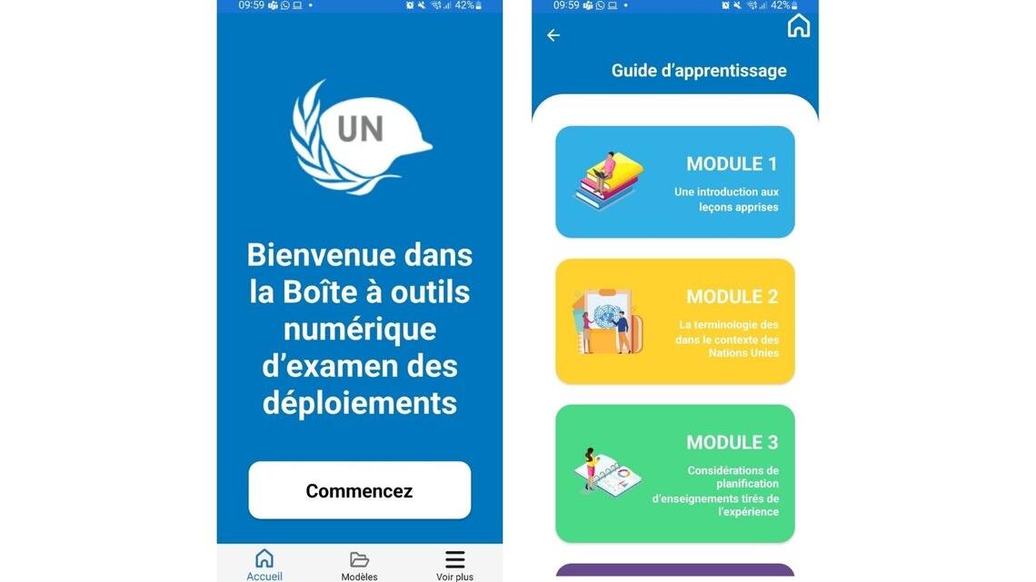 L’application mobile « Deployment Review » (examen du déploiement) est la première application mobile spécialement conçue par les Nations Unies pour permettre à l’ensemble des militaires et du personnel de police, des centres de formation et des académies d’avoir accès à une méthodologie de partage des connaissances. Les utilisateurs peuvent recueillir, analyser et examiner les réussites, les innovations et les difficultés découlant de leurs expériences opérationnelles, afin d’améliorer et d’optimiser la formation, la préparation et le soutien en vue de leurs futurs déploiements.